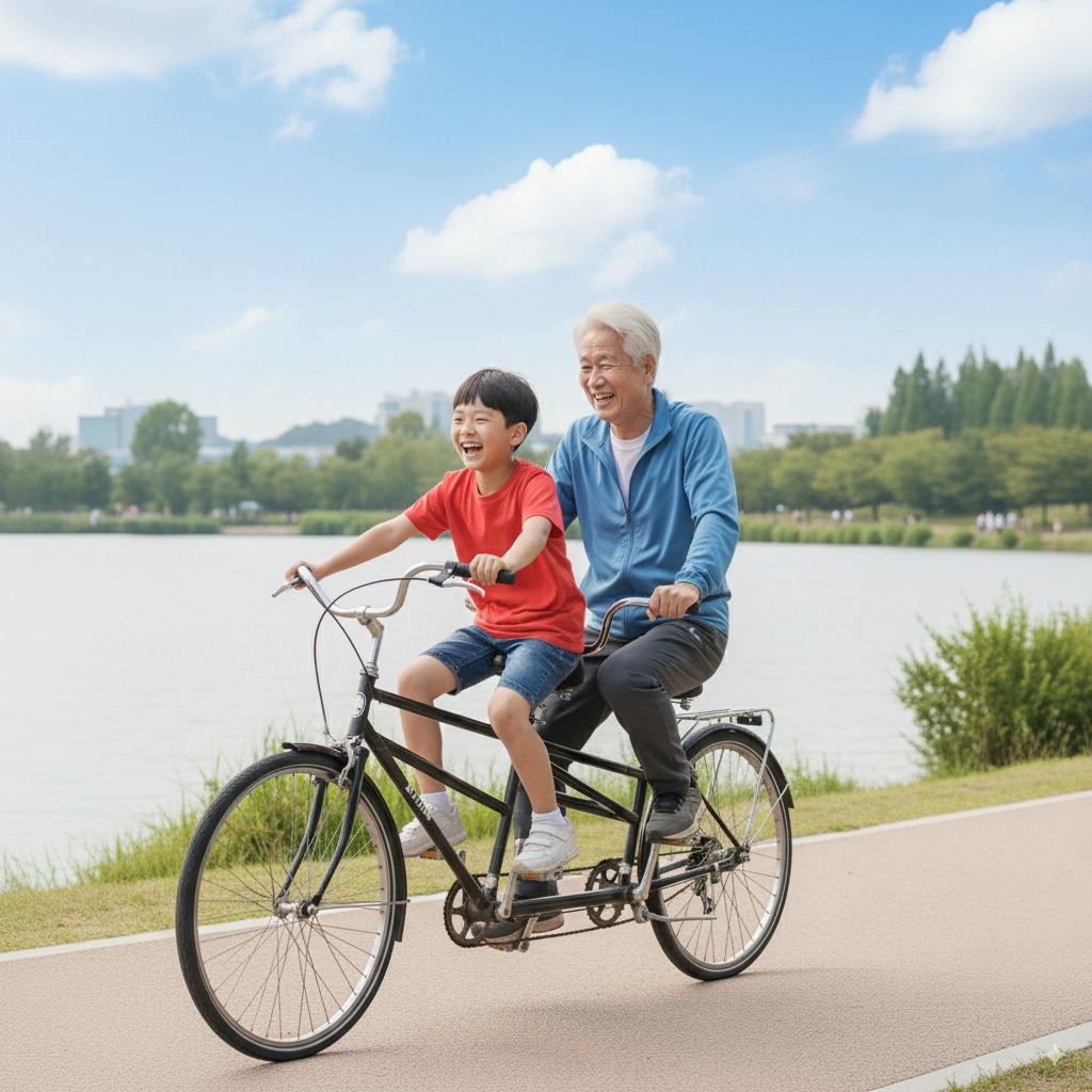고양시 일산 호수공원에서 할아버지와 손자가 함께 자전거를 타는 모습